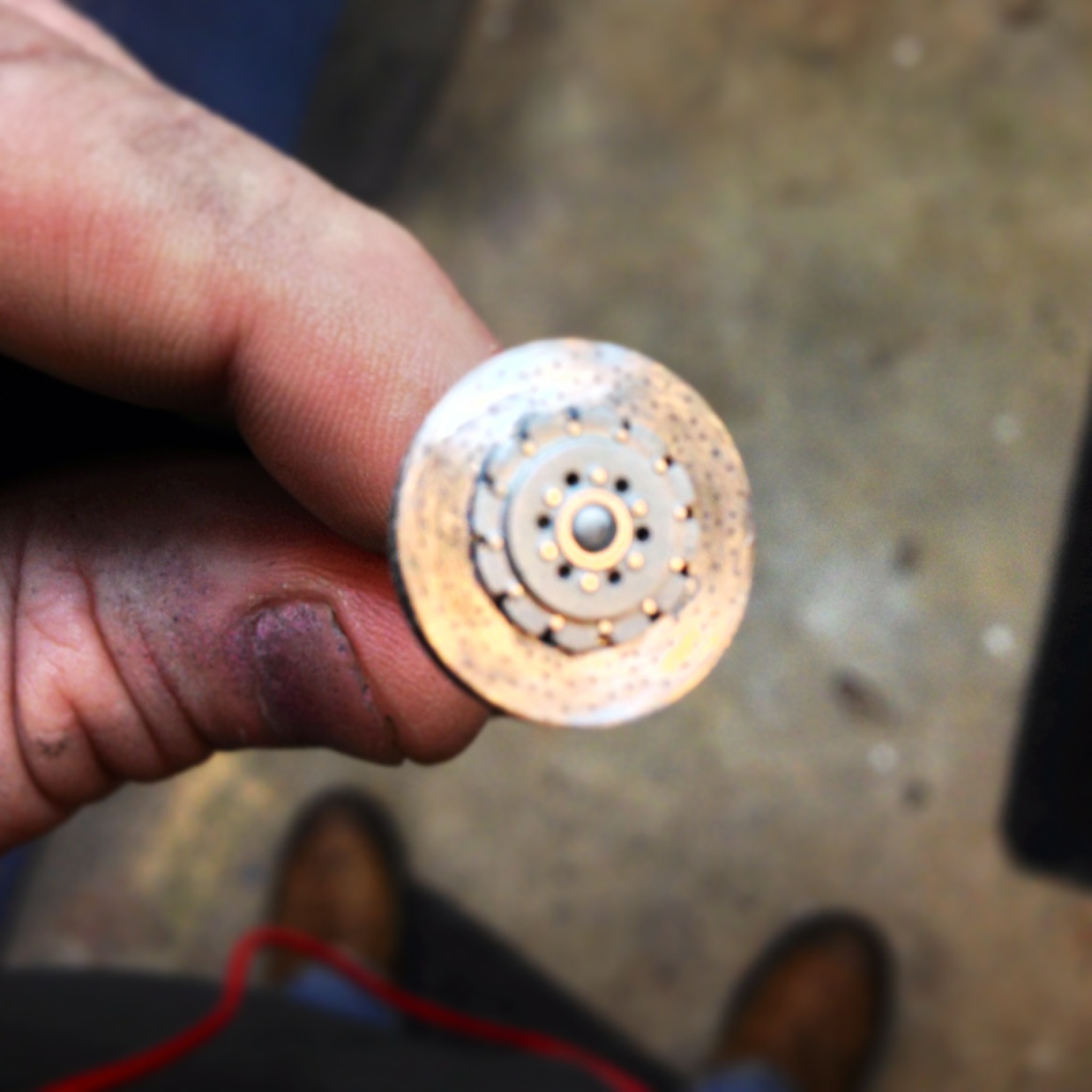 Been working on preparing all parts for paint….  Here are the efforts being made on the rotors.  (#74 Pin Drill Bit by hand with a pin vise)